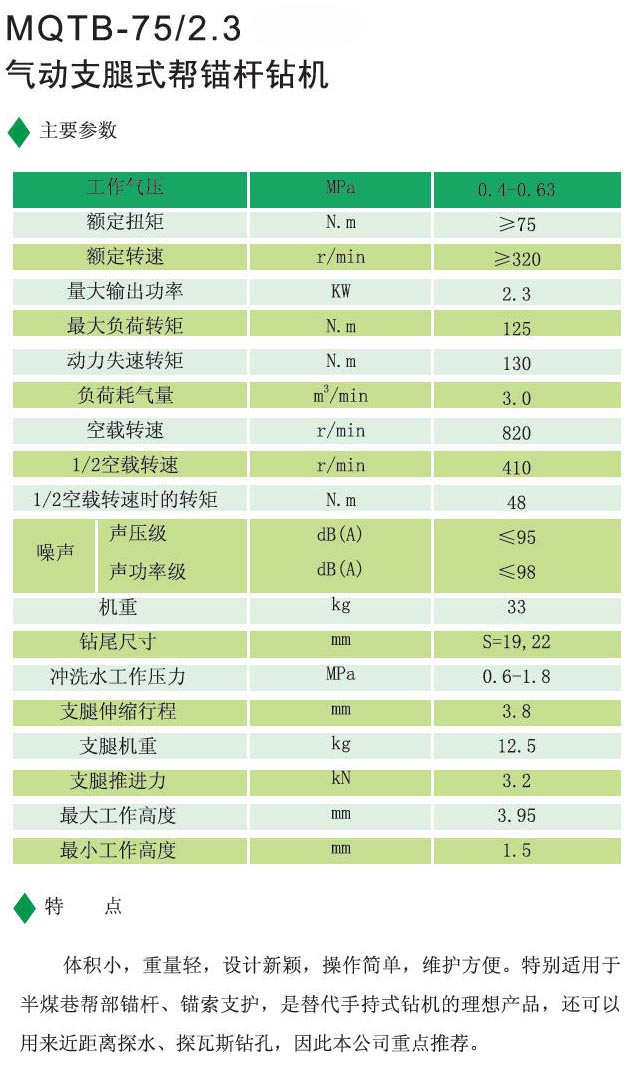 MQTB-75/2.3型氣動錨桿鉆機用于巖石硬度≤f8的煤巷,特別適合煤巷煤幫錨桿支護作業(yè).既可鉆錨桿孔,又可攪拌和安裝樹脂藥卷類的錨桿、錨索。